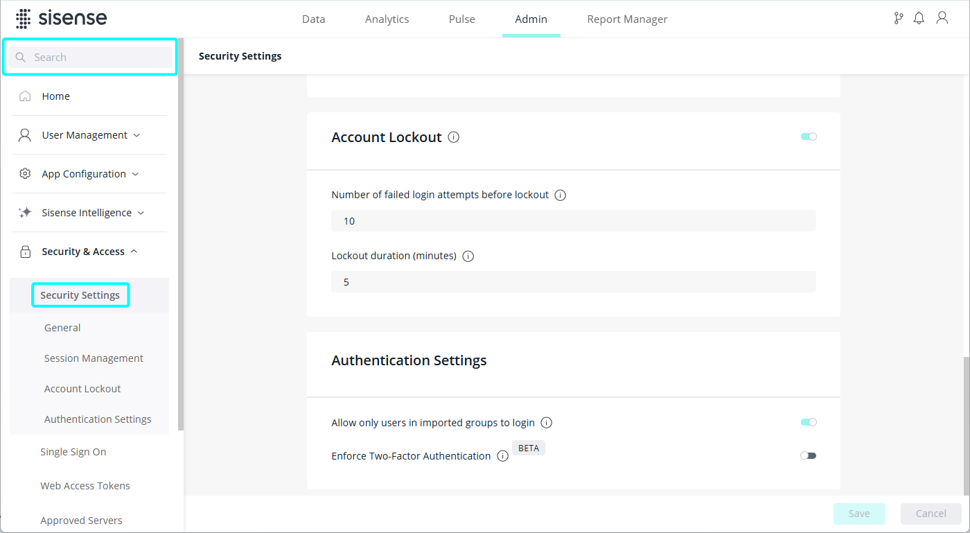 In the Settings tab of the Admin page, you can set your account lockout thresholds for your users. Account lockout thresholds determine after how many failed login attempts a user is locked out of Sisense and for how long. A locked account cannot be used until you unlock it or until the number of minutes specified by the Account lockout duration policy setting expires.