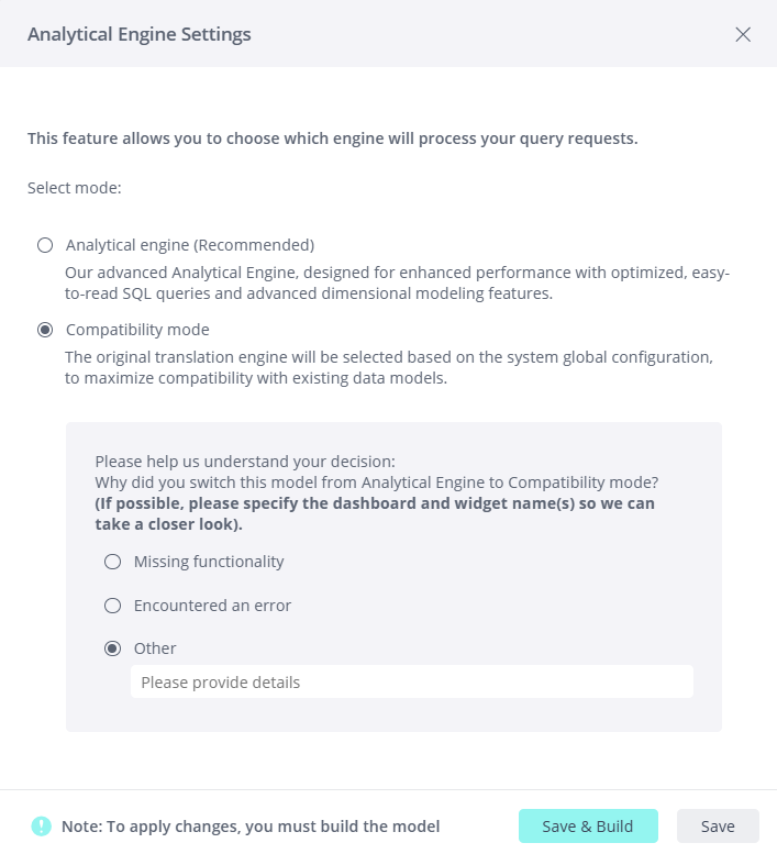 The Analytical Engine improves query precision by allowing you to define explicit modeling rules. This structured approach results in more controlled and optimized queries. However, because its methodology differs from the original translator, query results may not always be identical between the two. To mitigate potential issues, starting with version L2025.2, Sisense includes a fallback mode, "Compatibility mode", that reverts to the original translator, which you can set if you notice that the Analytical Engine encounters difficulties generating the expected results. This is a per model setting.