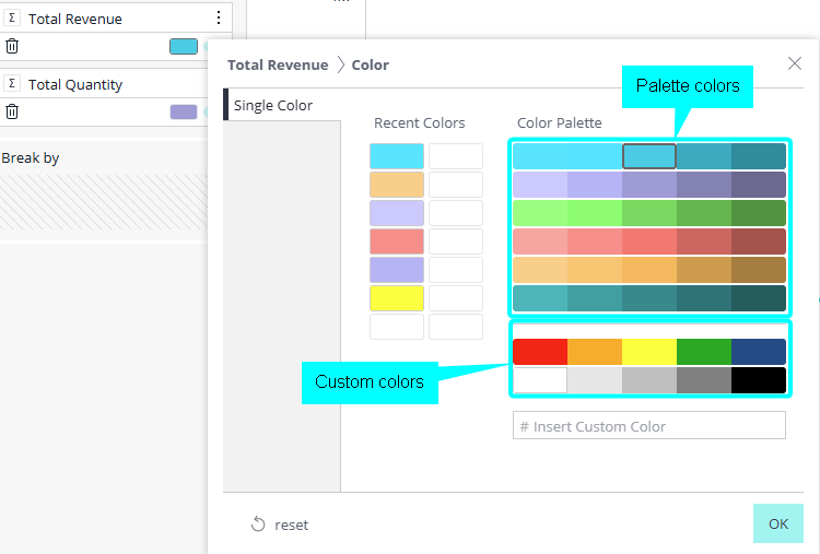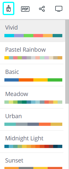 When you change the color of an individual widget to a new color that is not one of the palette colors, the new color will be applied to the widget regardless of the applied palette. If you select a new color from one of the palette colors, then when changing the dashboard's palette, the color will change according to the new palette.