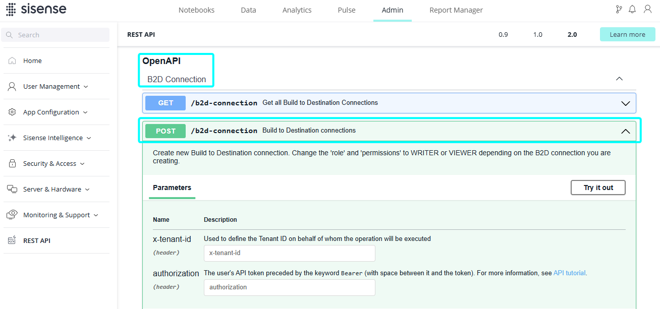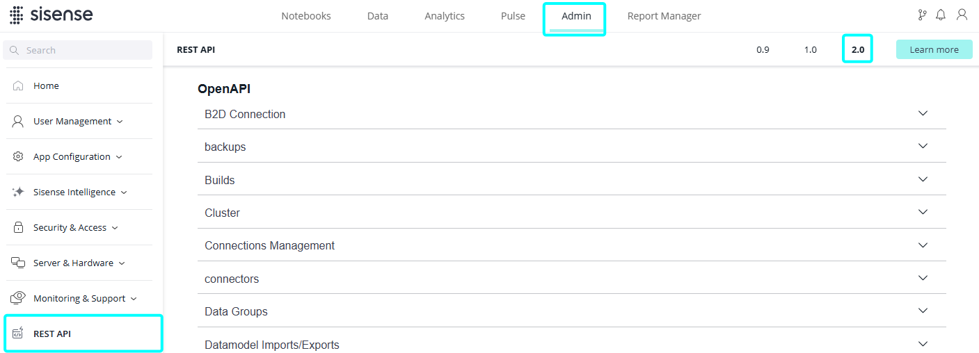 Click the Admin tab > Rest API > 2.0.