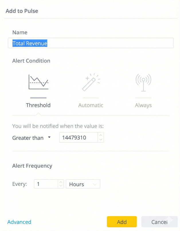 - Click Add to create the alert. The alert is added to Sisense Pulse.