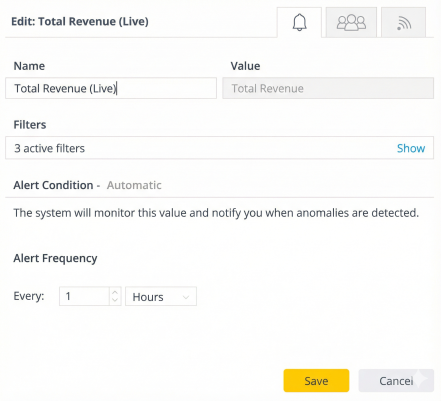 Sisense automatically notifies you when the Sisense alert engine identifies an anomaly in your data based on machine learning algorithms. The Sisense algorithm actively learns from your data and eliminates noise to identify anomalies in your data. Sisense's anomaly detection is based on a smoothing algorithm that takes the latest values into account. The more times an ElastiCube is built or a Live model is published, the more accurate Sisense becomes at identifying any anomalies and notifying you.