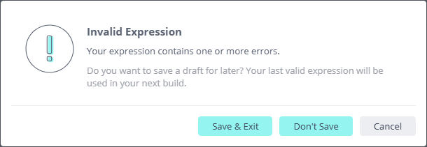 If you save the invalid expression, Sisense continues to use the last valid expression that was saved when building an ElastiCube , but the next time you open a preview of the table, the invalid expression will be displayed. This allows you to continue building working ElastiCube s while letting you save incomplete expressions for later.