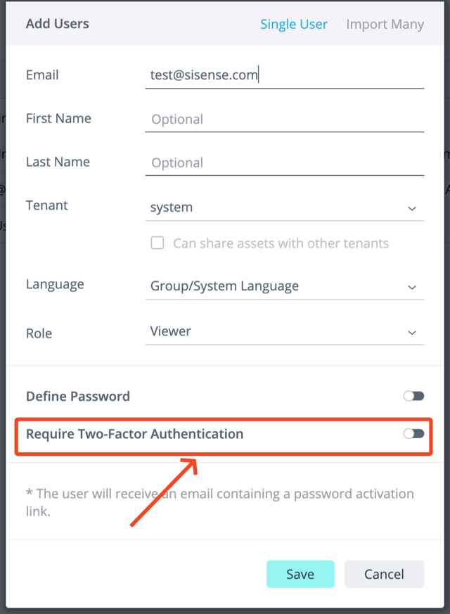 To ensure that the authentication email and overall system are configured correctly, Sisense suggests testing 2FA for a small number of users and then enabling the System-Wide 2FA feature toggle. If it is working as expected, user-level 2FA configuration can then be applied to all required native users. Doing this will help ensure users don't experience breaking changes.
