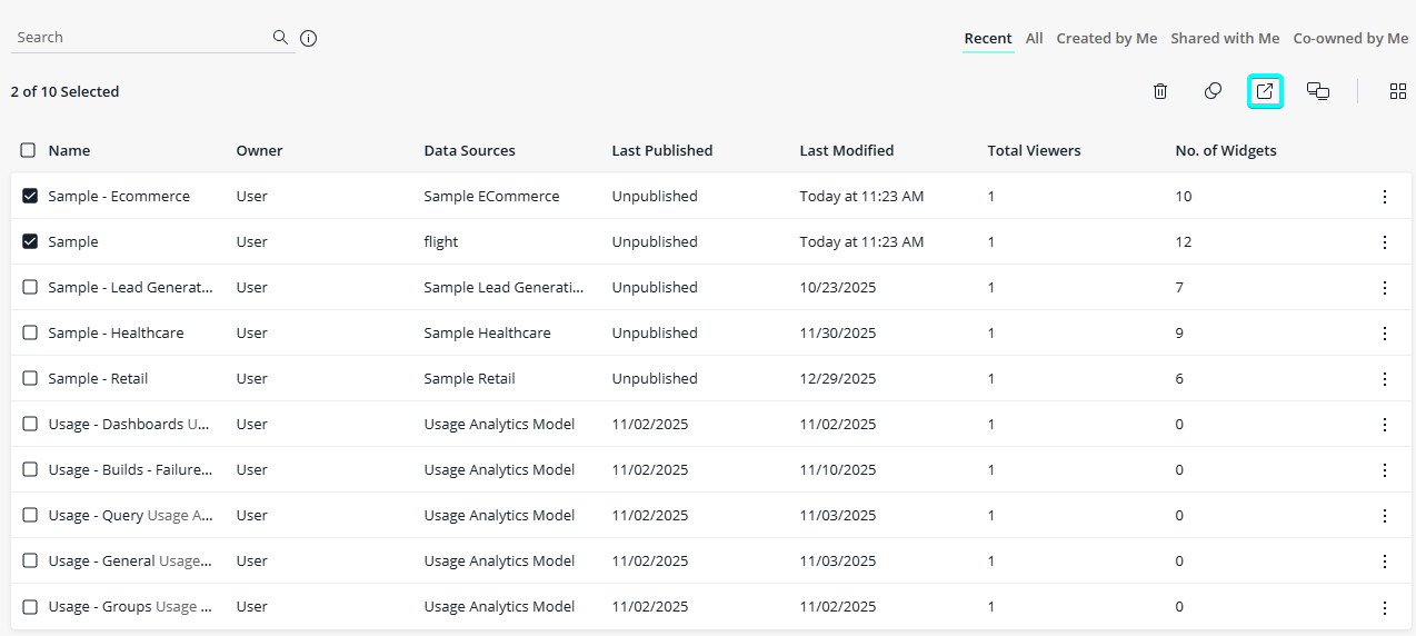 For more information on co-authored dashboards, see Changing Ownership of a Dashboard.
