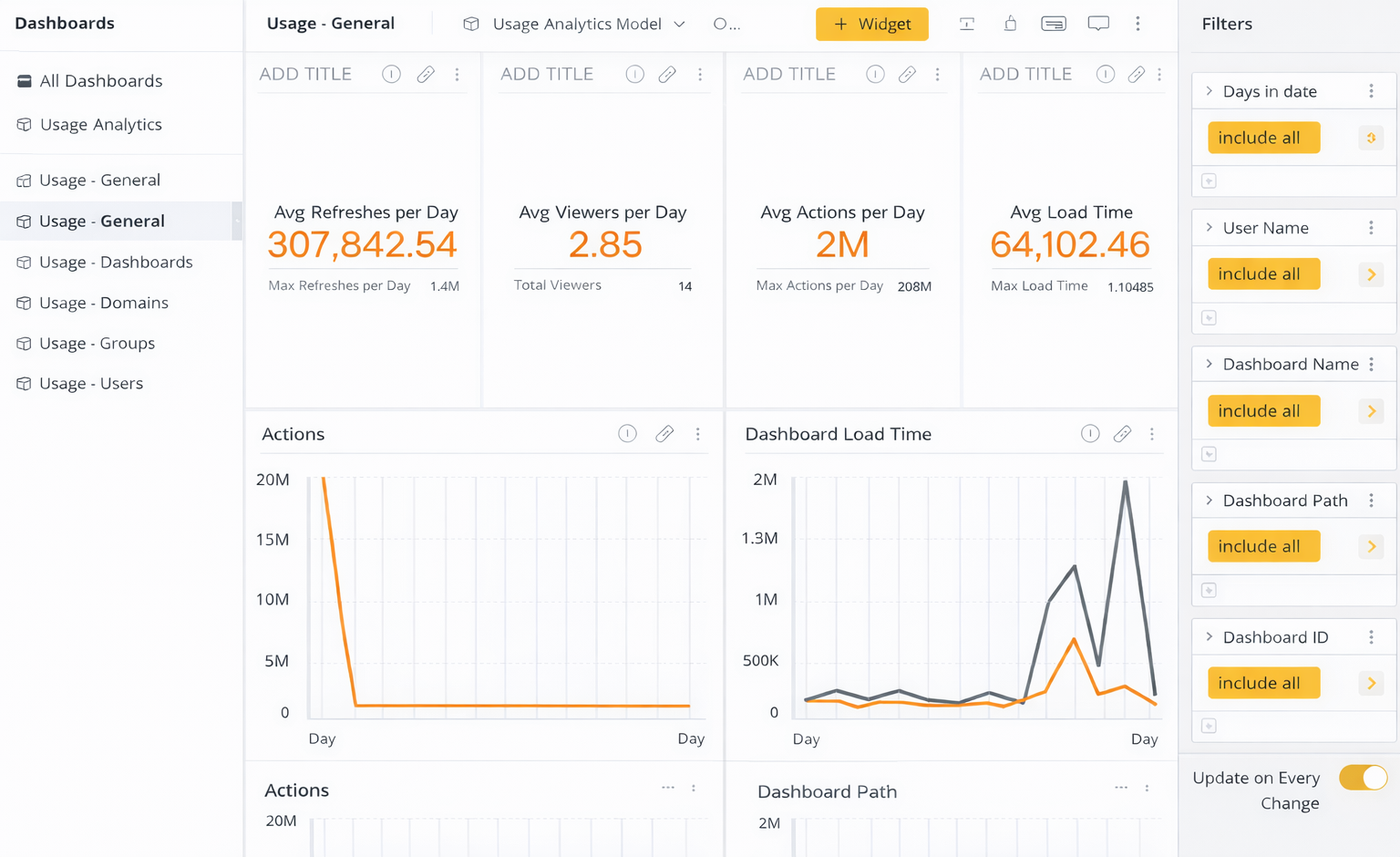 The Usage - General dashboard provides you with insights regarding your Sisense system, including how often Sisense is being used and its performance.