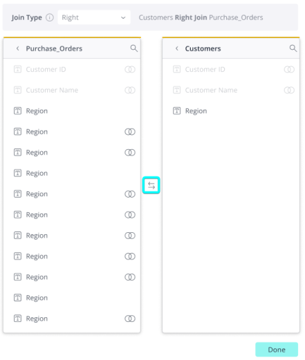 When creating a join between 2 tables, users can switch which table appears on the left and right sides of the join panel by clicking the button (see screenshot below).