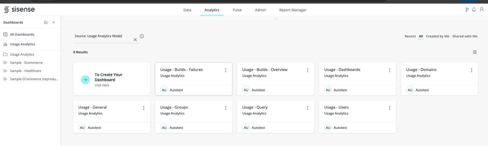 Sisense Usage Analytics is a set of predefined dashboards and ElastiCubes that enable you to monitor your Sisense user and dashboard activity. With Sisense Usage Analytics, you can better understand how users are interacting with Sisense dashboards and optimize your configuration accordingly. For example, you can understand which dashboards are making an impact and how fast the dashboards are loading.