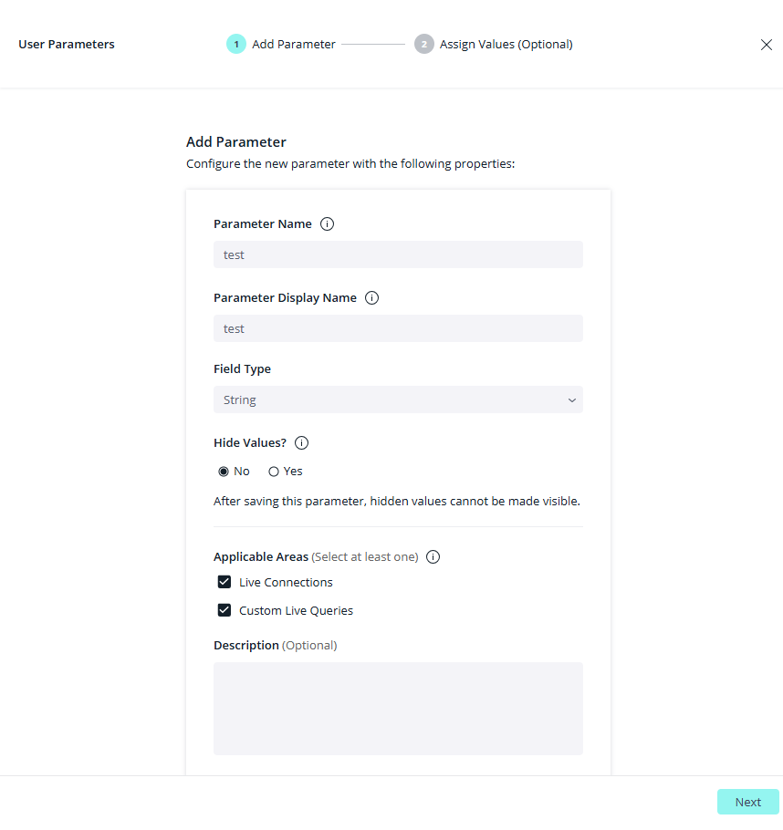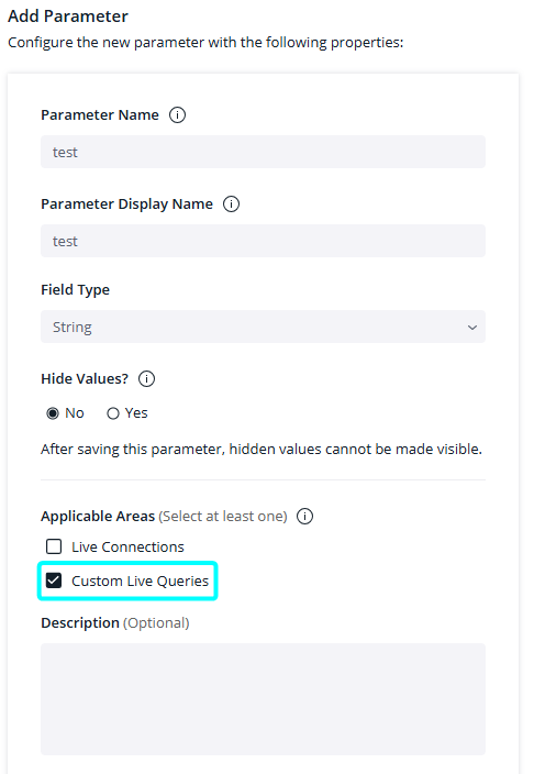 Custom Live Queries - When selected, the parameter will be available in the Import Query window.