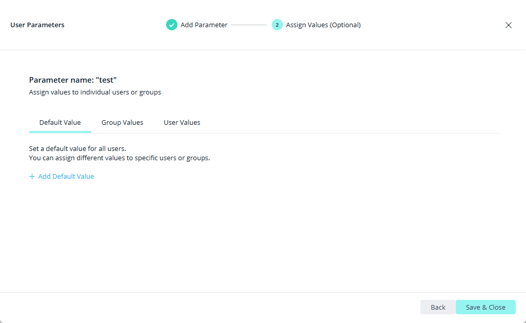 Assign values for the parameter at the user (if relevant) and group (if relevant) levels, and assign a default value for the parameter (compulsory).