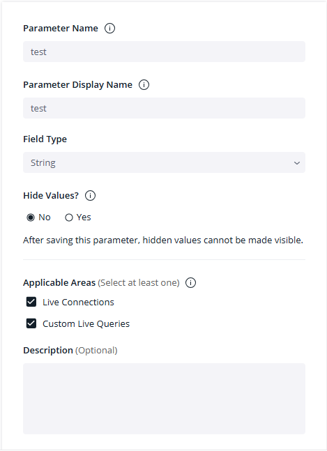 Hidden Values - Set whether the parameter's value is hidden or visible when using the parameter in the data model.