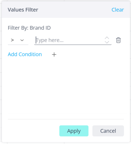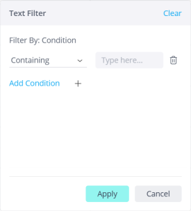 - Define your filters. Click Add Condition to add more conditions to the filter or click Clear to erase all the conditions.