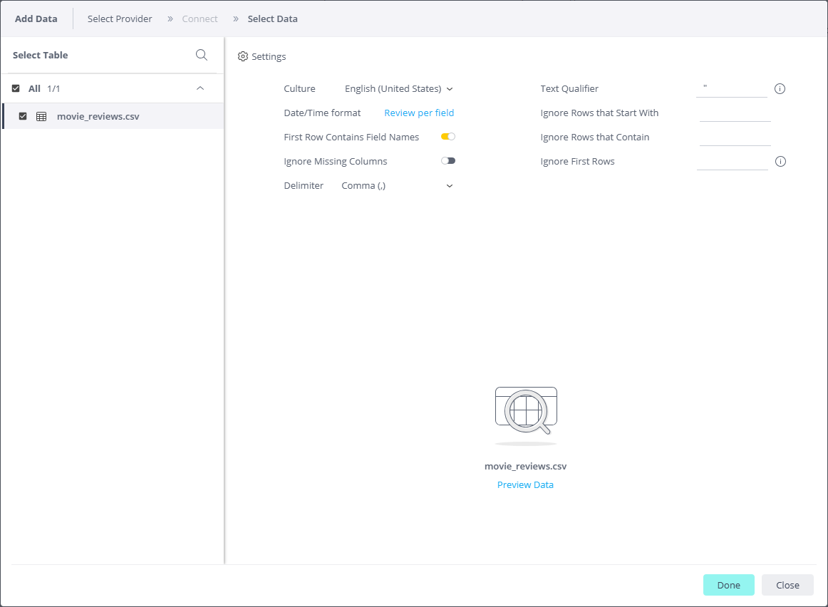 To preview results before connecting to a table: