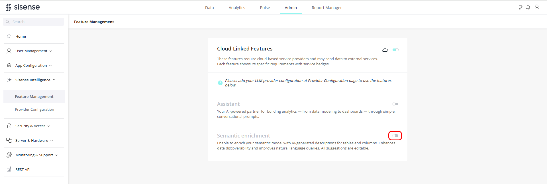 This feature is currently off by default. In order to use Semantic Enrichment, it must be enabled by an Admin, in the Admin tab, under Sisense Intelligence > Feature Management.