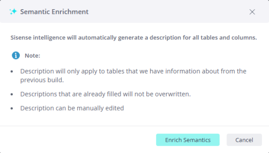 Semantic Enrichment enables you to use Sisense Intelligence to automatically provide descriptions for your data models’ tables and columns. This assists data administrators in creating clear and informative text that can be utilized by both humans and the Sisense Intelligence assistant. The primary purpose of the enrichment is to enable the assistant to better understand the models and to improve the answers provided. The descriptions will cover key aspects of the data, such as its nature, its usage, optional formatting for textual IDs, and a summary of the data's time granularity and attributes.