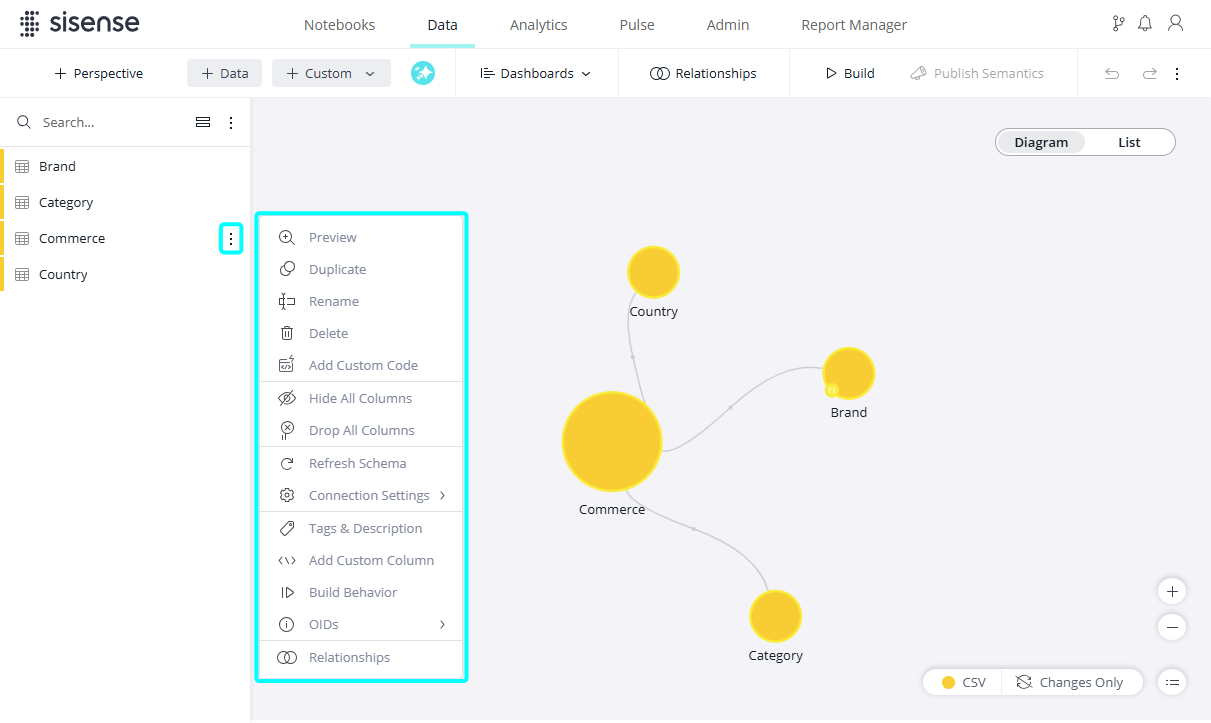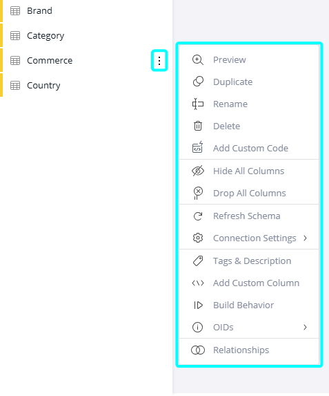 | Relationships | Enables you to select two tables and a column to create a relationship. See Creating and Removing a Relationship Between Tables. |
