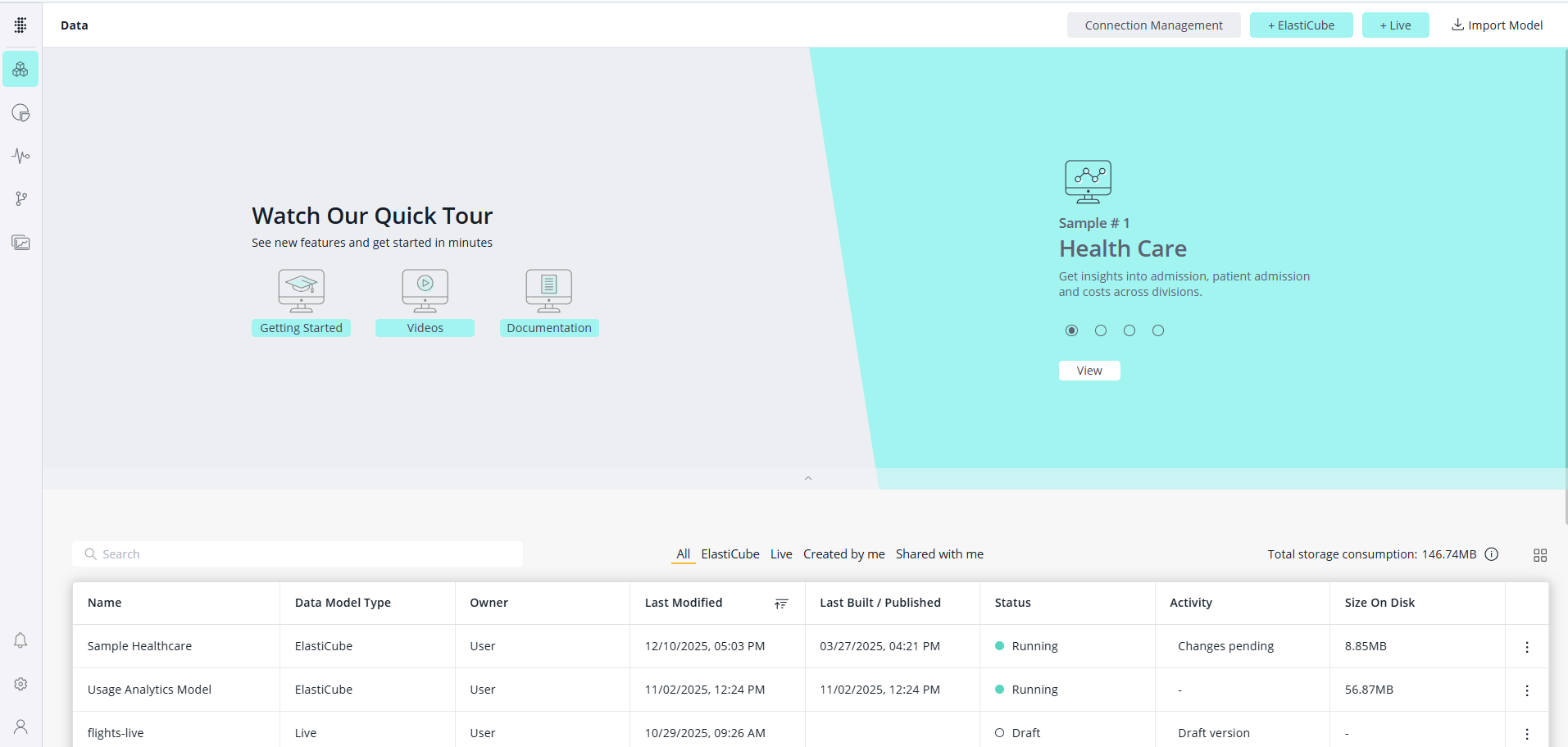 Total storage consumption - The total storage space consumed by ElastiCubes on this instance; if the list is filtered, the total size is adjusted accordingly.